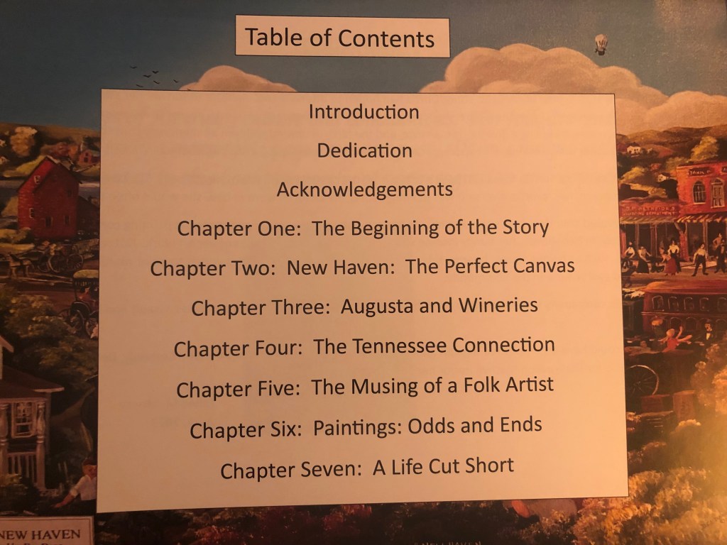 Chapter One: The Beginning of the Story Chapter Two: New Haven: The Perfect Canvas Chapter Three: Augusta and Wineries Chapter Four: The Tennessee Connection Chapter Five: The Musing of a Folk Artist Chapter Six: Paintings: Odds and Ends Chapter Seven: A Life Cut Short
